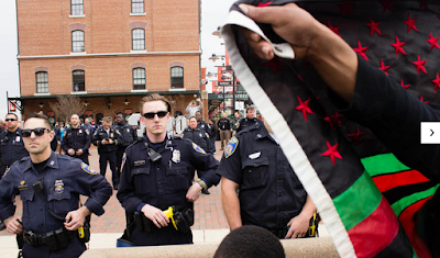 In that image shot by Jerome Freeman, a 25-year-old Columbia resident, the divide between the police and the people protesting the death of Freddie Gray is evident at a glance. It seems almost inevitable that what began as peaceful demonstrations are about to erupt.The black, green and red flag of blacks is getting ready to be raised in 65 percent black Baltimore, a city with a black mayor (who can't stop blasting cops for not putting their lives on the line to stop black people from committing crime); a black police chief; a black fire chief; a majority black city council; and a black state's attorney.